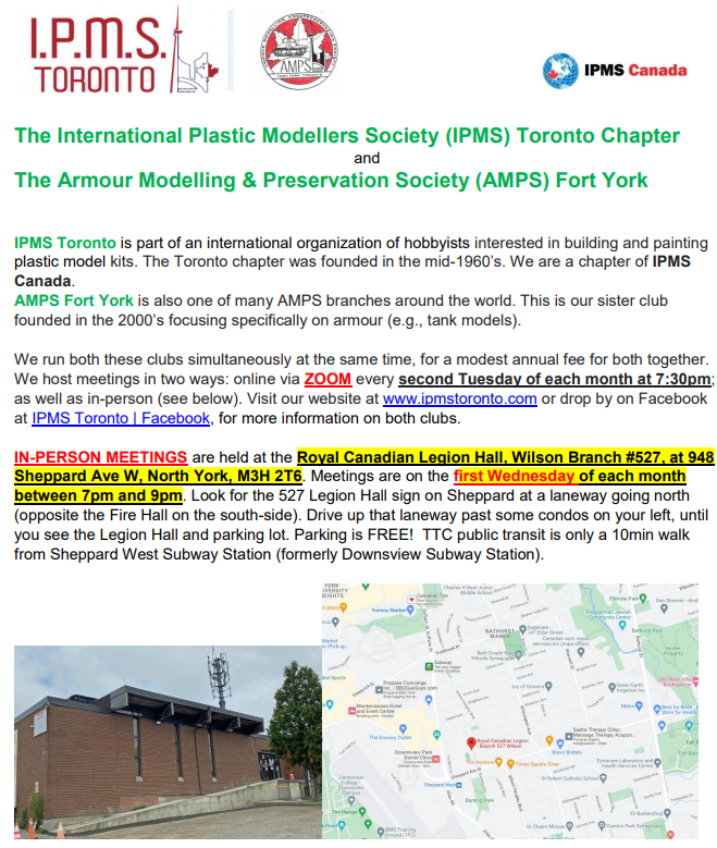 IPMS Toronto meetings are on the move again! Per the details in the flyer below, we have secured a new meeting space and have rescheduled the meetings to the first Wednesday of each month, back in the traditional 7-9 timeslot. Info has also been updated on the Meetings page of IPMSToronto.com.
